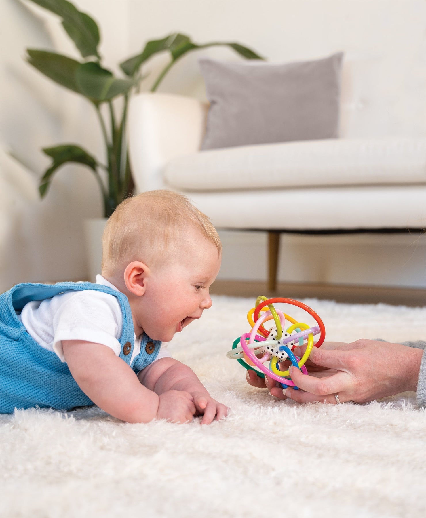 - Soft, pliable plastic loops for grasping and teething